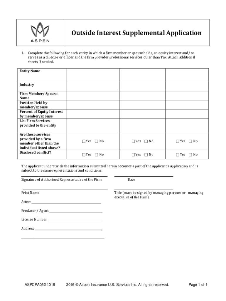Outside Interest Supplemental Application 1. Complete the following for each entity in which a firm member or spouse holds, an equity interest and/ or serves as a director or officer and the firm