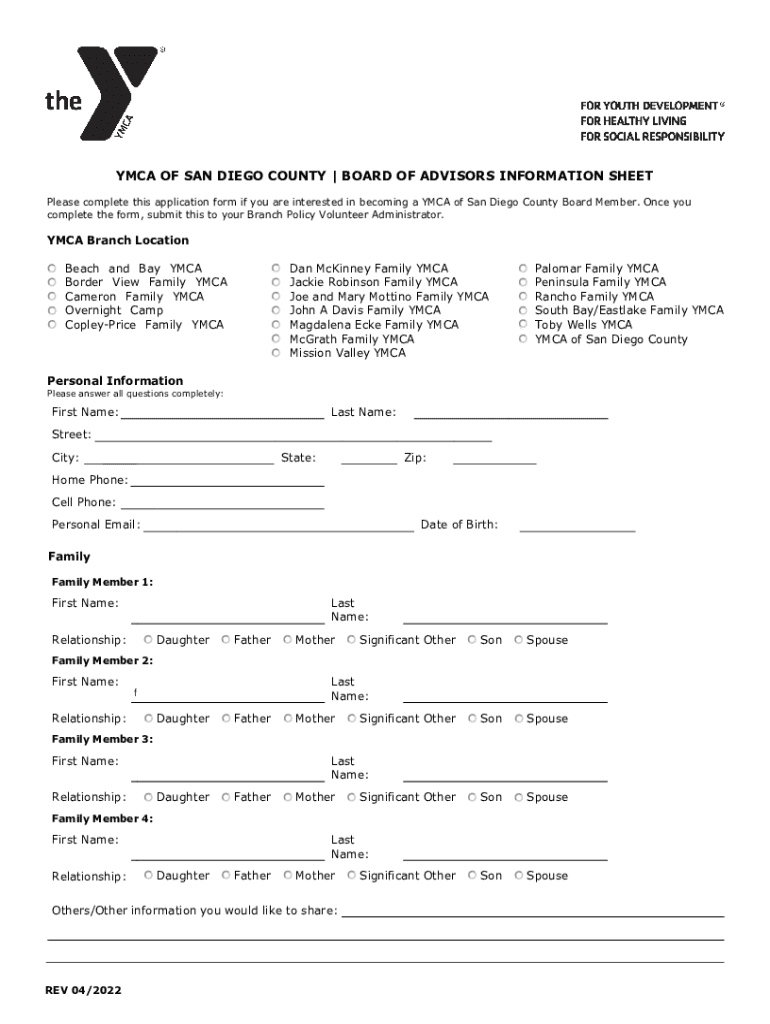 YMCA OF SAN DIEGO COUNTY | BOARD OF ADVISORS INFORMATION SHEET Please complete this application form if you are interested in becoming a YMCA of San Diego County Board Member. Once you complete the