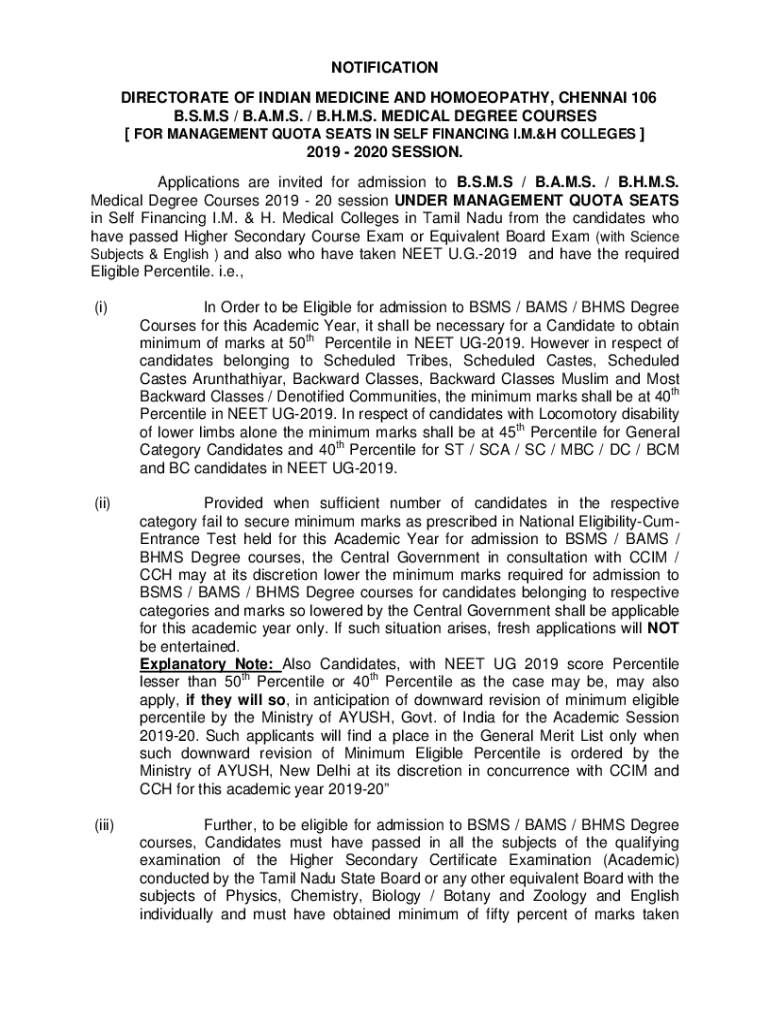 NOTIFICATION DIRECTORATE OF INDIAN MEDICINE AND Homeopathy, CHENNAI 106 B.S.M.S / B.A.M.S. / B.H.M.S. MEDICAL DEGREE COURSES [FOR MANAGEMENT QUOTA SEATS IN SELF FINANCING I.M.OH COLLEGES] 2019 2020