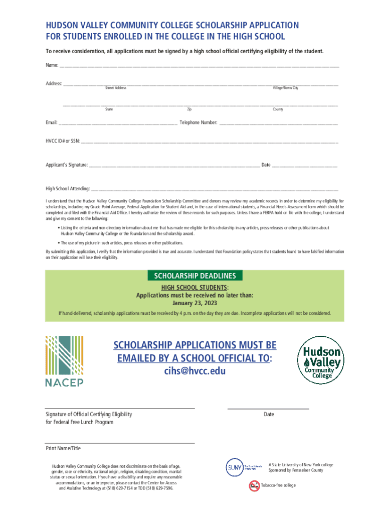 HUDSON VALLEY COMMUNITY COLLEGE SCHOLARSHIP APPLICATION FOR STUDENTS ENROLLED IN THE COLLEGE IN THE HIGH SCHOOL To receive consideration, all applications must be signed by a high school official