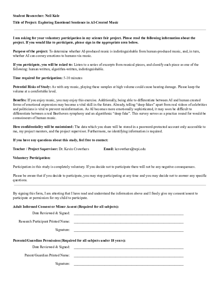 Student Researcher: Neil Kale Title of Project: Exploring Emotional Sentience in Created Music am I asking for your voluntary participation in my science fair project. Please read the following information