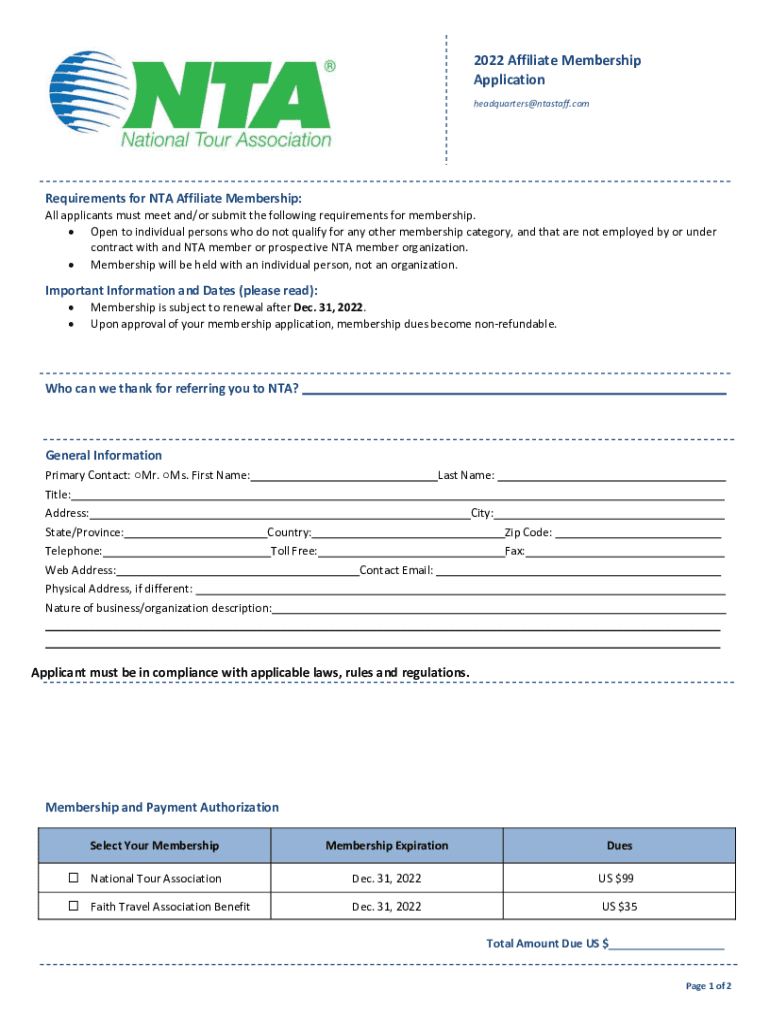 2022 Affiliate Membership Application headquarters@ntastaff.comRequirements for TNA Affiliate Membership: All applicants must meet and/or submit the following requirements for membership. Open to