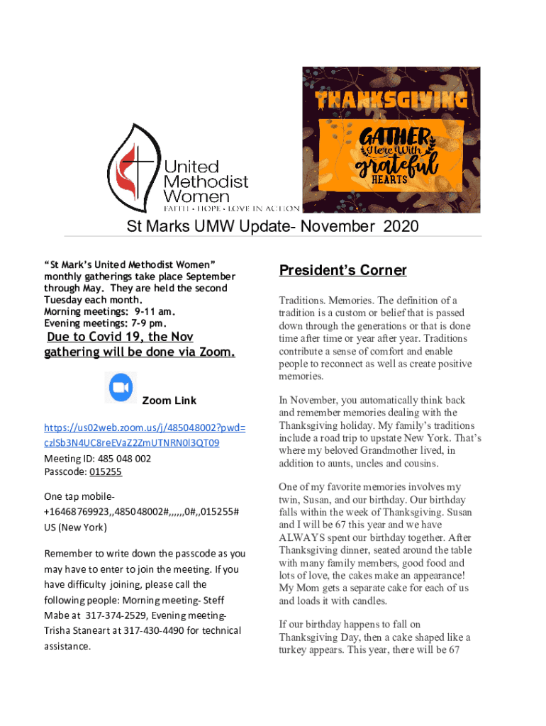 St Marks BMW Update November 2020 St Marks United Methodist Women monthly gatherings take place September through May. They are held the second Tuesday each month. Morning meetings: 911 am. Evening
