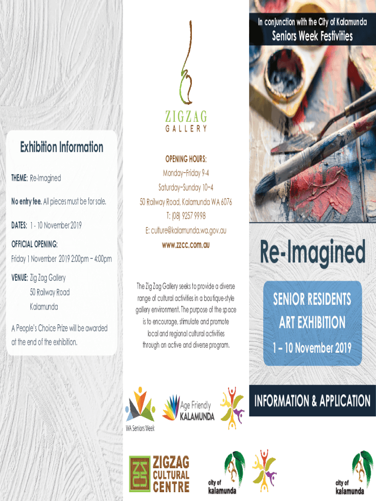 In conjunction with the City of KalamundaSeniors Week FestivitiesExhibition Information THEME:ReImagined No entry fee. All pieces must be for sale. DATES:1 10 November 2019 OFFICIAL OPENING:OPENING
