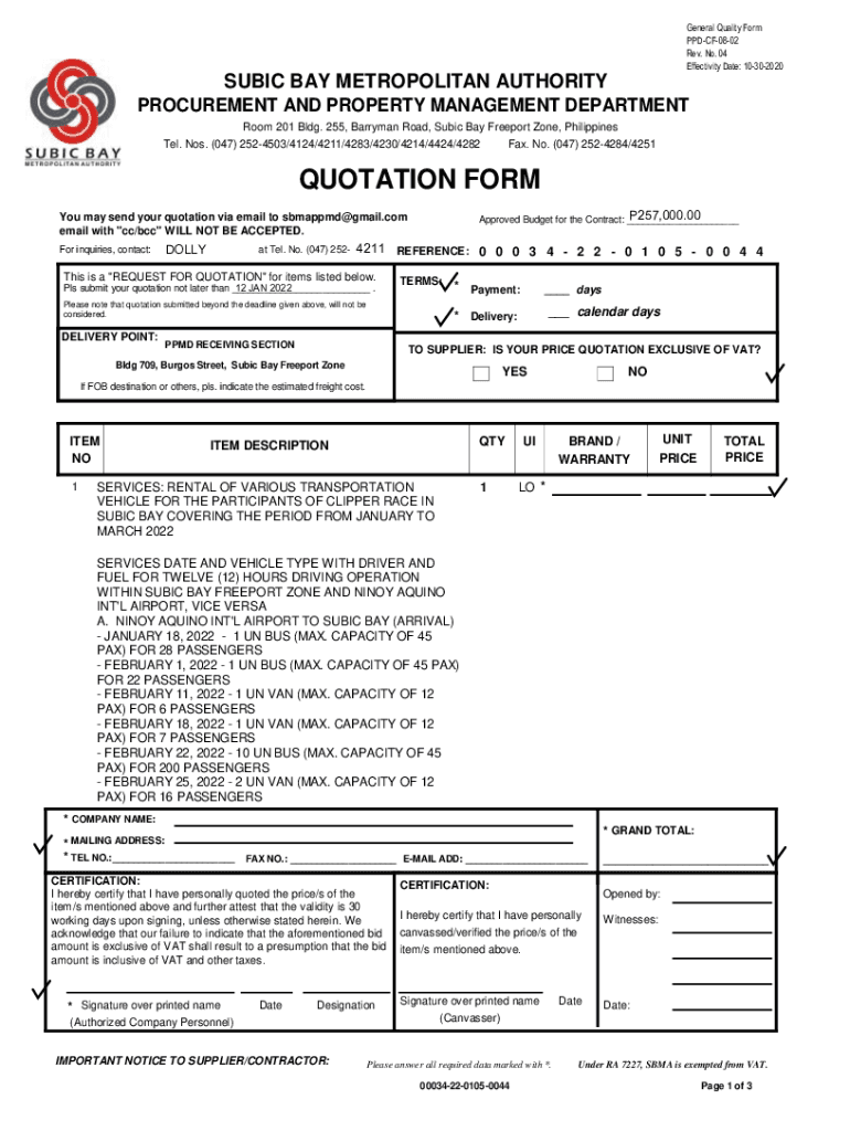 Get the free QUOTATION FORM - BRMS - Subic Bay Metropolitan Authority