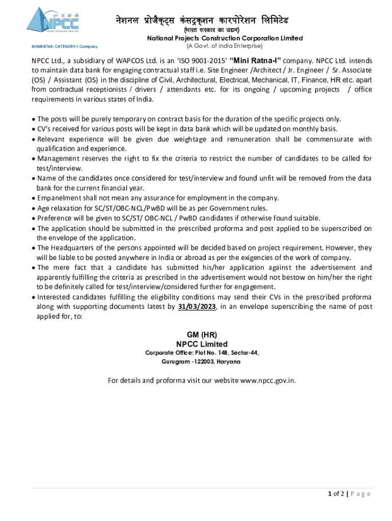 National Projects Construction Corporation LimitedMINIRATNA: CATEGORY Company(A Govt. of India Enterprise)NPC Ltd., a subsidiary of MARCOS Ltd. is an ISO 90012015 Mini Patna company.
