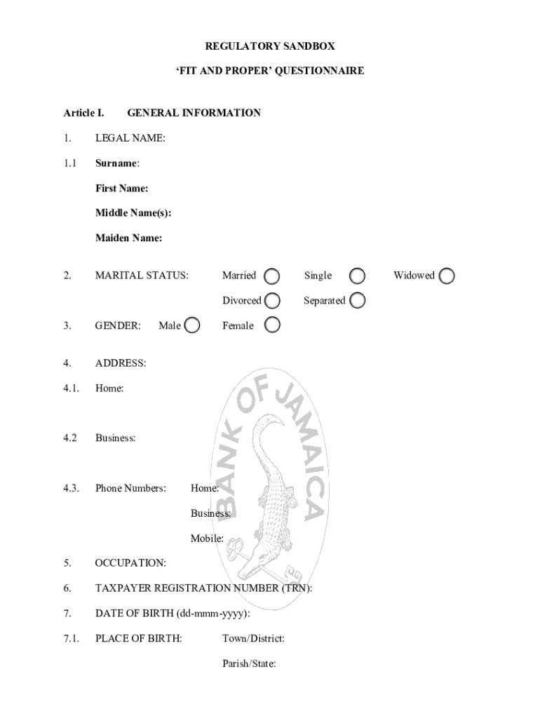 REGULATORY SANDBOX FIT AND PROPER QUESTIONNAIRE Article I.GENERAL INFORMATION1.LEGAL NAME:1.1Surname: First Name: Middle Name(s): Maiden Name:2.MARITAL STATUS:3.GENDER:Male4.ADDRESS:4.1. Home:4.2Business:4.3.
