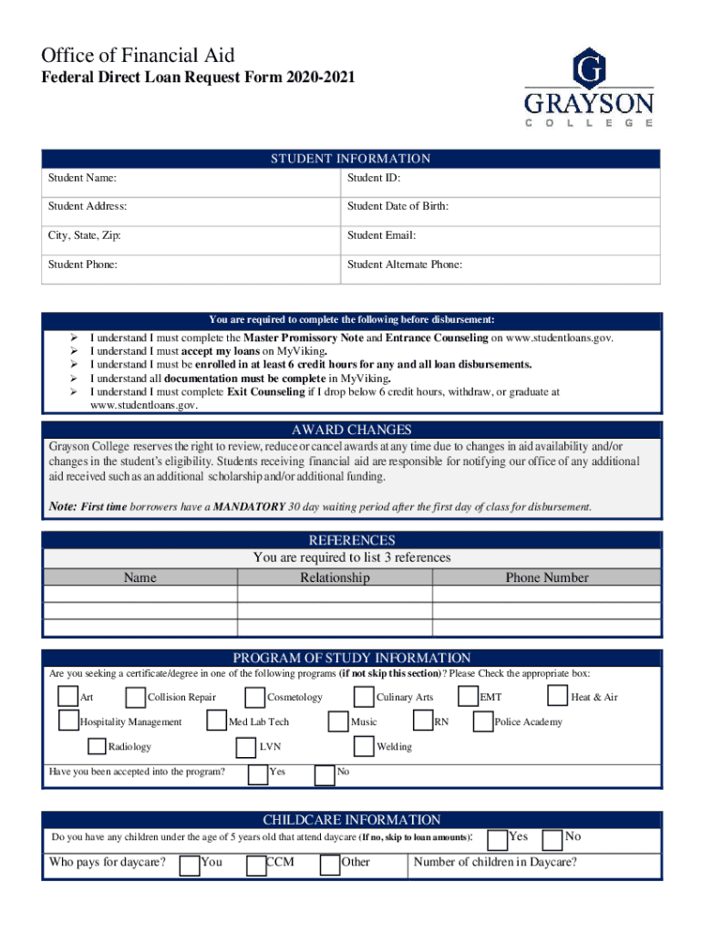 Office of Financial Aid Federal Direct Loan Request Form 20202021STUDENT INFORMATION Student Name:Student ID:Student Address:Student Date of Birth:City, State, Zip:Student Email:Student Phone:Student