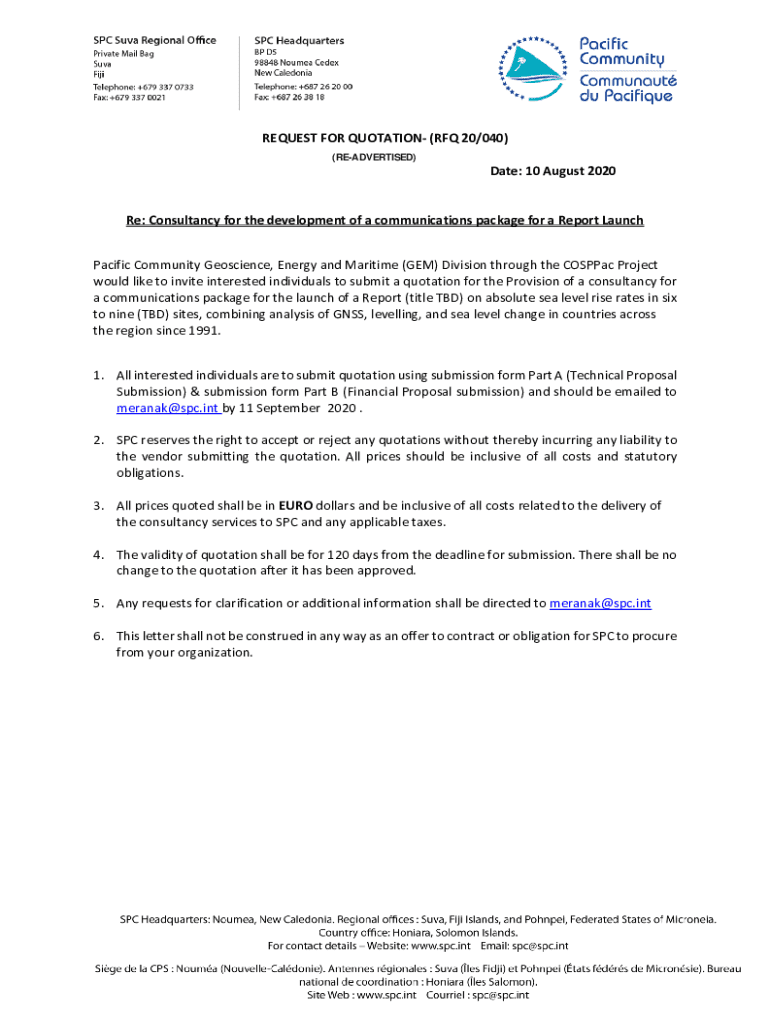 REQUEST FOR QUOTATION (RFQ 20/040) (ADVERTISED)Date: 10 August 2020Re: Consultancy for the development of a communications package for a Report Launch Pacific Community Geoscience, Energy and Maritime