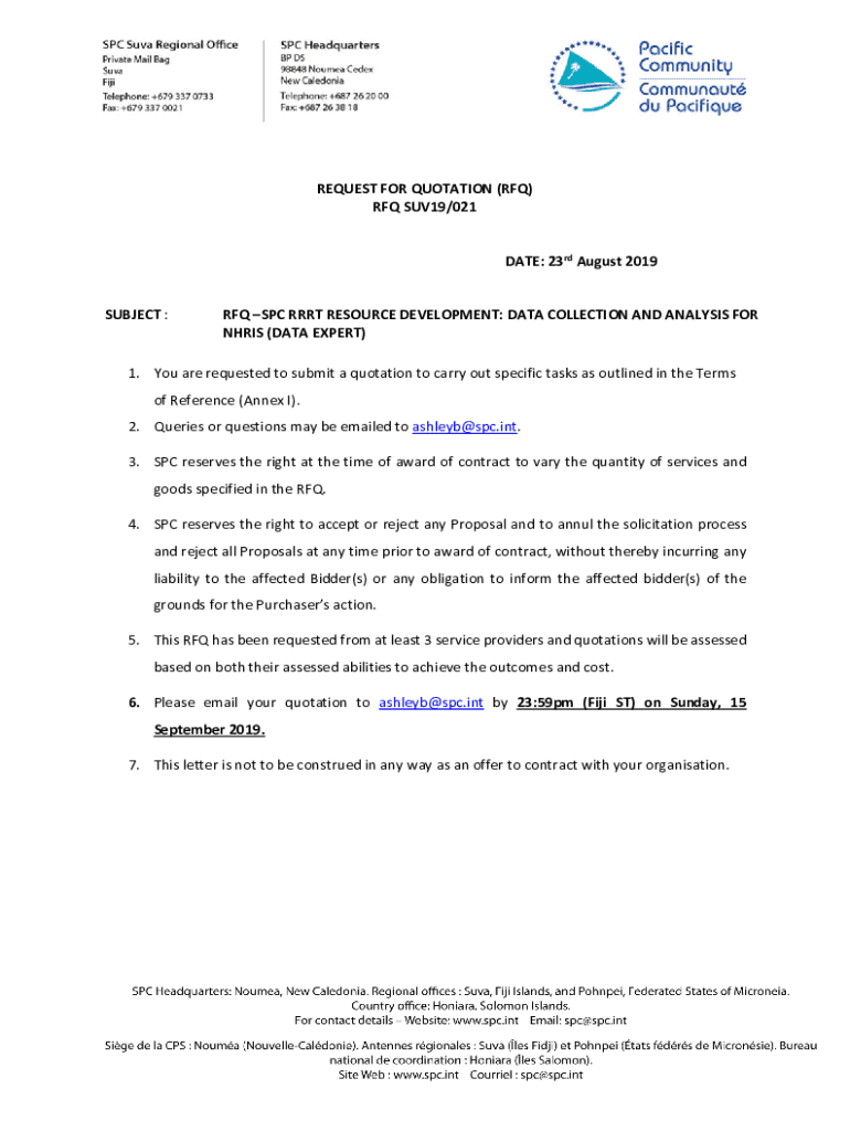 REQUEST FOR QUOTATION (RFQ) RFQ SUV19/021DATE: 23rd August 2019SUBJECT :RFQ SPC RRR RESOURCE DEVELOPMENT: DATA COLLECTION AND ANALYSIS FOR CHRIS (DATA EXPERT)1. You are requested to submit a quotation