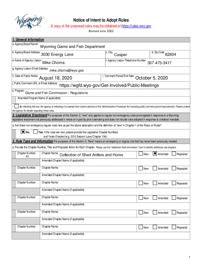 Notice of Intent to Adopt Rules A copy of the proposed rules may be obtained at https://rules.wyo.gov RevisedJune2020 1. General Information a. Agency/Board Name×Wyoming Game and Fish Department.