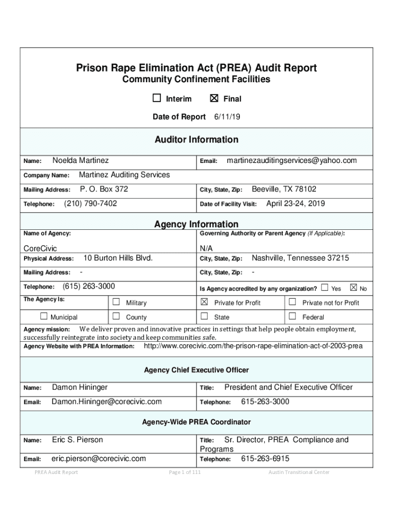 Community Confinement FacilitiesInterimDate of ReportFinal6/11/19Auditor Information