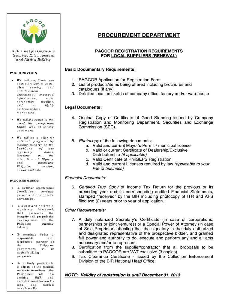PROCUREMENT DEPARTMENT A Sure bet for Progress in Gaming, Entertainment and Nation Building PAYCOR REGISTRATION REQUIREMENTS FOR LOCAL SUPPLIERS (RENEWAL) Basic Documentary Requirements: PASTORS VISION