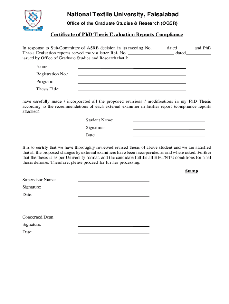 Get the free Certificate of PhD Thesis Evaluation Reports Compliance - ntu edu
