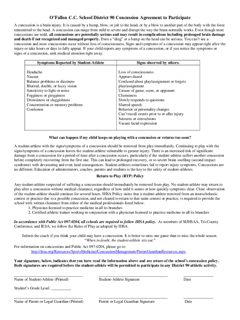 District 90 - concussion forms are typically needed by students who have experienced a concussion while participating in school sports or extracurricular activities. In some cases, parents or guardians may also need to fill out this form on behalf of a minor child.