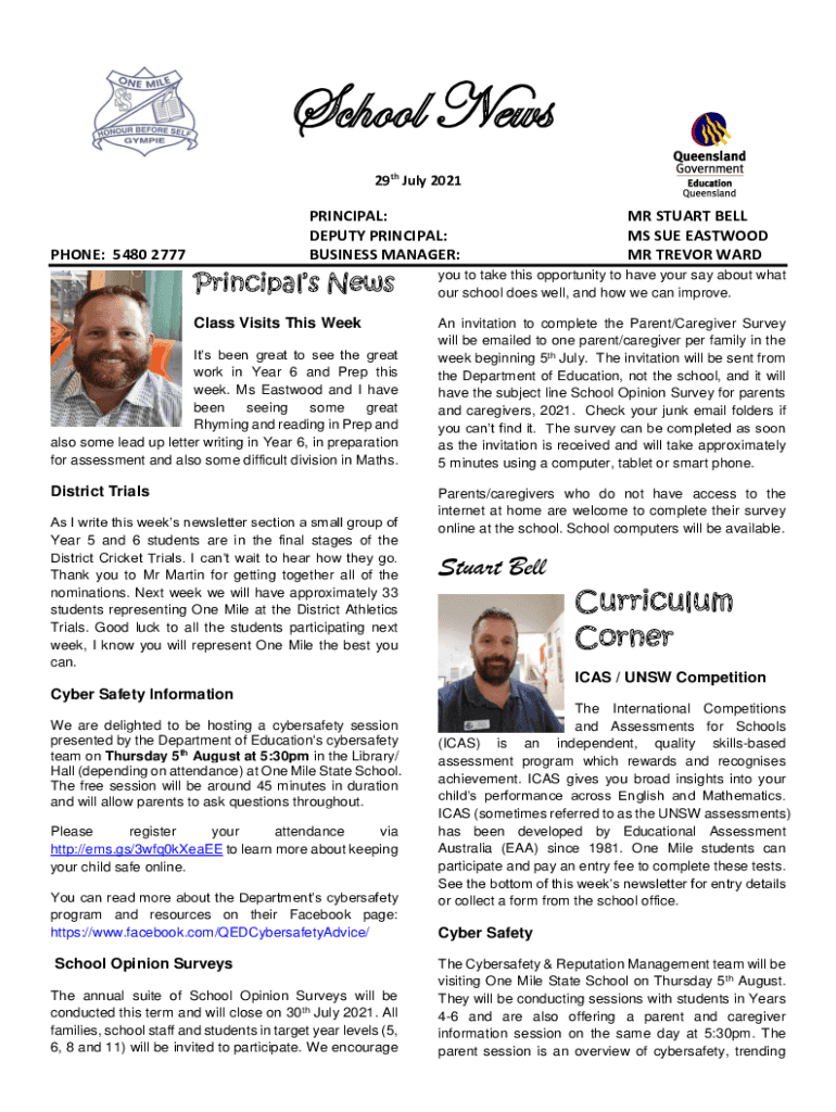 School News 29th July 2021PRINCIPAL: DEPUTY PRINCIPAL: BUSINESS MANAGER:PHONE: 5480 2777MR STUART BELL MS SUE EASTWOOD MR TREVOR WARDPrincipals News you to take this opportunity to have your say about