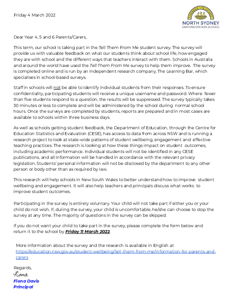 Friday 4 March 2022Dear Year 4, 5 and 6 Parents/Carers, This term, our school is taking part in to Tell Them From Me student survey. The survey will provide us with valuable feedback on what our students