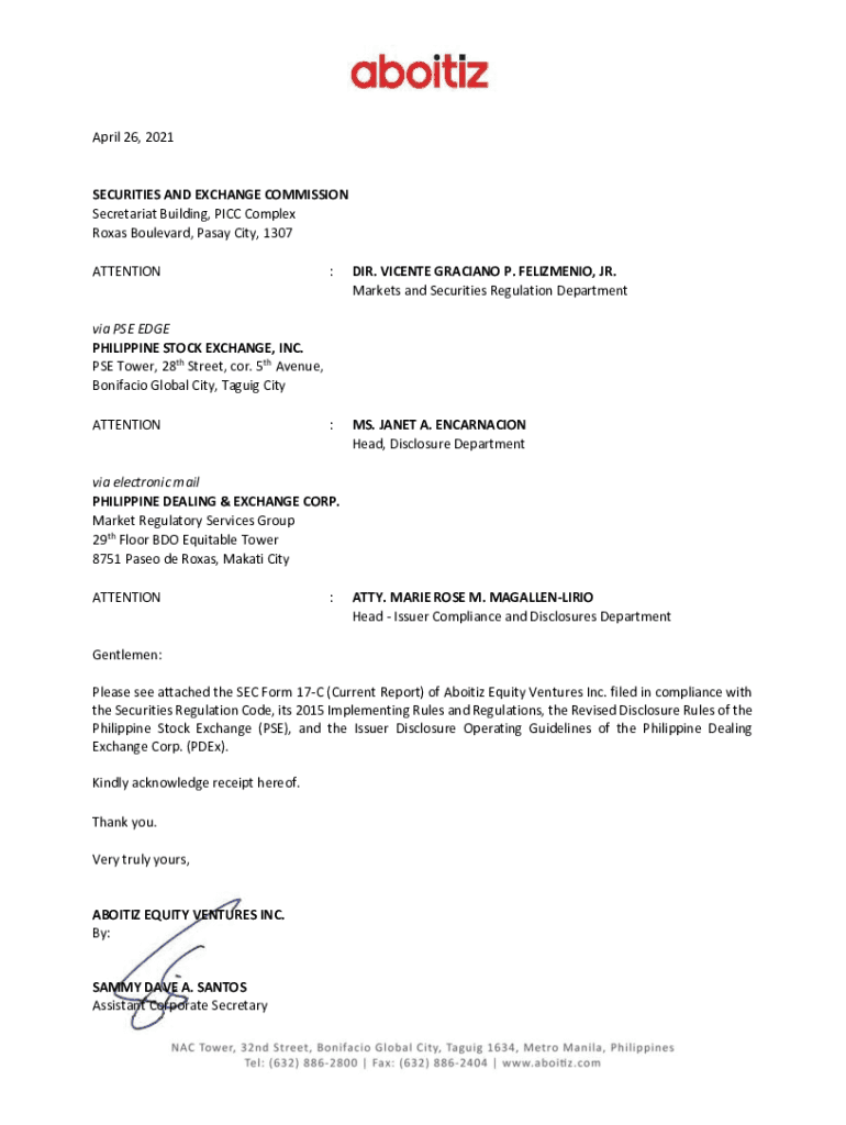 April 26, 2021SECURITIES AND EXCHANGE COMMISSION Secretariat Building, PICC Complex Rojas Boulevard, Pasty City, 1307 ATTENTION:DIR. VICENTE GRACIANO P. FELIZMENIO, JR. Markets and Securities Regulation