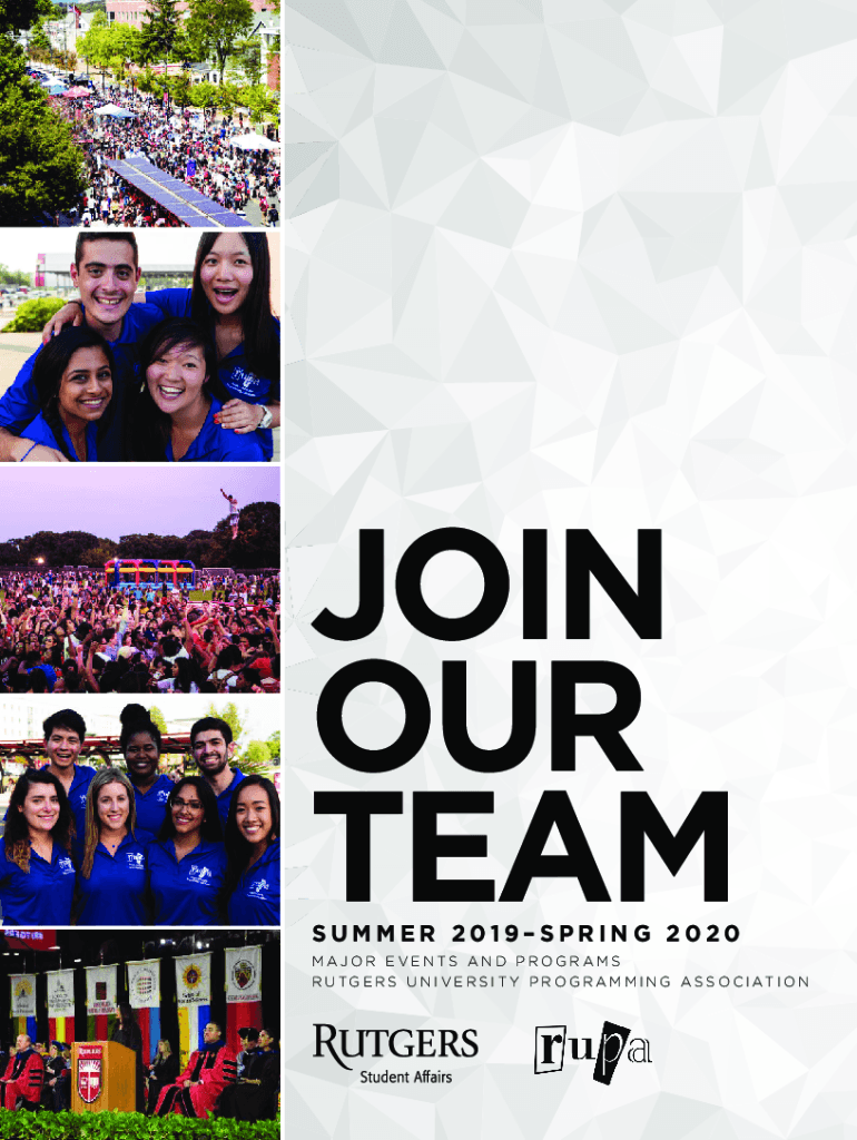 JOIN OUR TEAM SUMMER 2019SPRING 2020MAJOR EVENTS AND PROGRAMS R U T G E R S U N I V E R S I T Y P R O G R A M M I N G A S S O C I AT I ON APPLY ONLINE: RUPA.RUTGERS.EDU/JOIN APPLICATION DEADLINE: