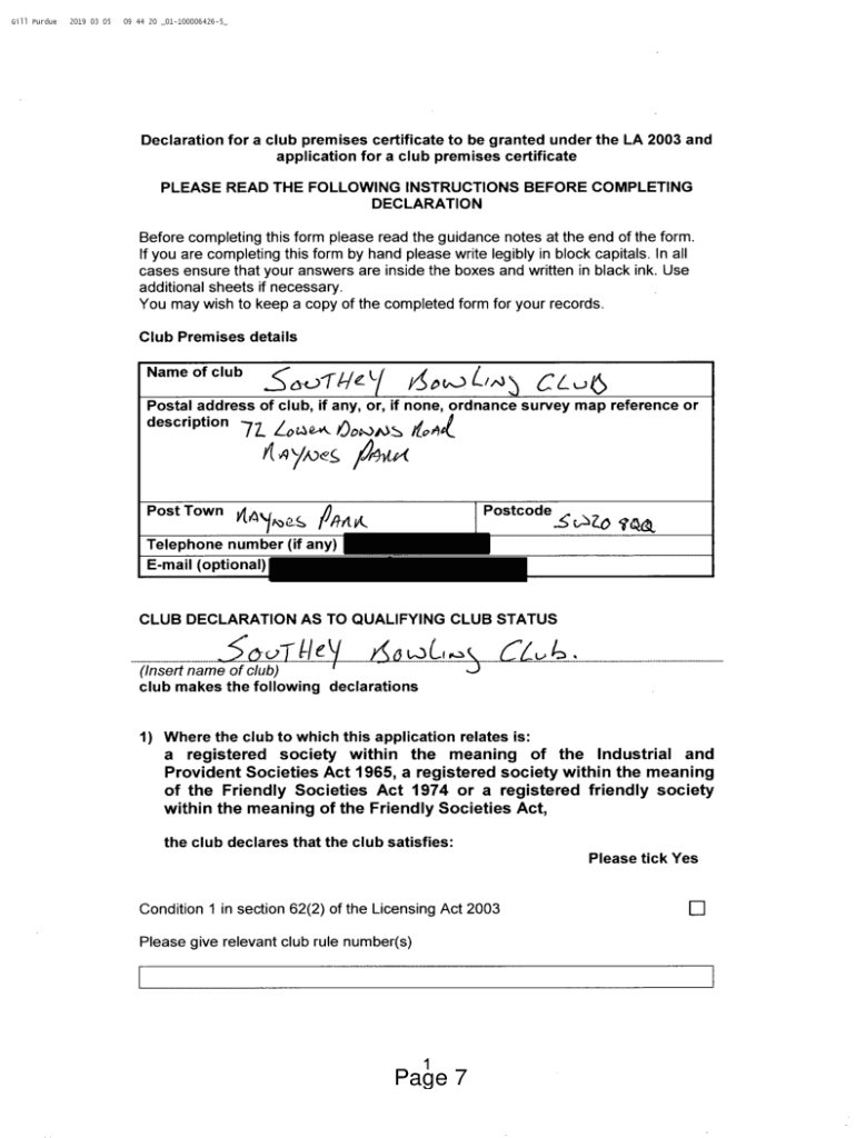 Gill Purdue2019 03 0509 44 20 _011000064265_Declaration for a club premises certificate to be granted under the LA 2003 and application for a club premises certificate PLEASE READ THE Following instructions