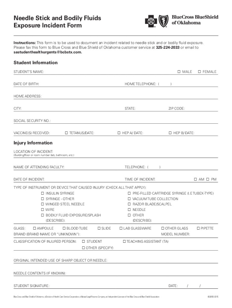 Needle Stick and Bodily Fluids Exposure Incident Form Instructions: This form is to be used to document an incident related to needle stick and or bodily fluid exposure. Please fax this form to Blue