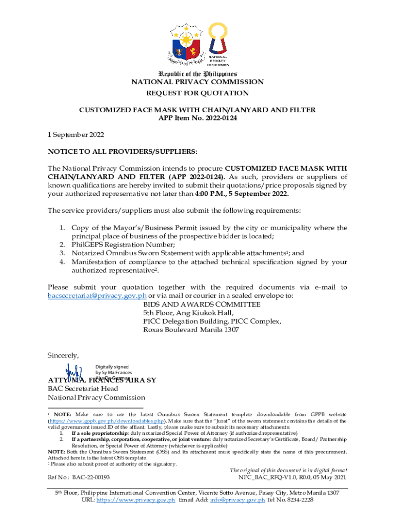 Republic of the Philippines NATIONAL PRIVACY COMMISSION REQUEST FOR QUOTATION CUSTOMIZED FACE MASK WITH CHAIN/LANYARD AND FILTER APP Item No. 20220124 1 September 2022 NOTICE TO ALL PROVIDERS/SUPPLIERS: