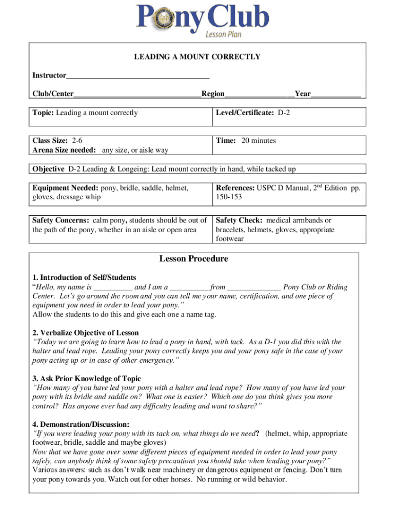 LEADING A MOUNT CORRECTLY Instructor___ Club/Center___Region___Year___ Topic: Leading a mount correctlyLevel/Certificate: D2Class Size: 26 Arena Size needed: any size, or aisle daytime: 20 minutesObjective