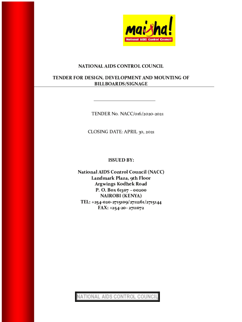 NATIONAL AIDS CONTROL COUNCIL TENDER FOR DESIGN, DEVELOPMENT AND MOUNTING OF BILLBOARDS/SIGNAGE ___ TENDER No. NAC/016/20202021CLOSING DATE: APRIL 30, 2021ISSUED BY: National AIDS Control Council