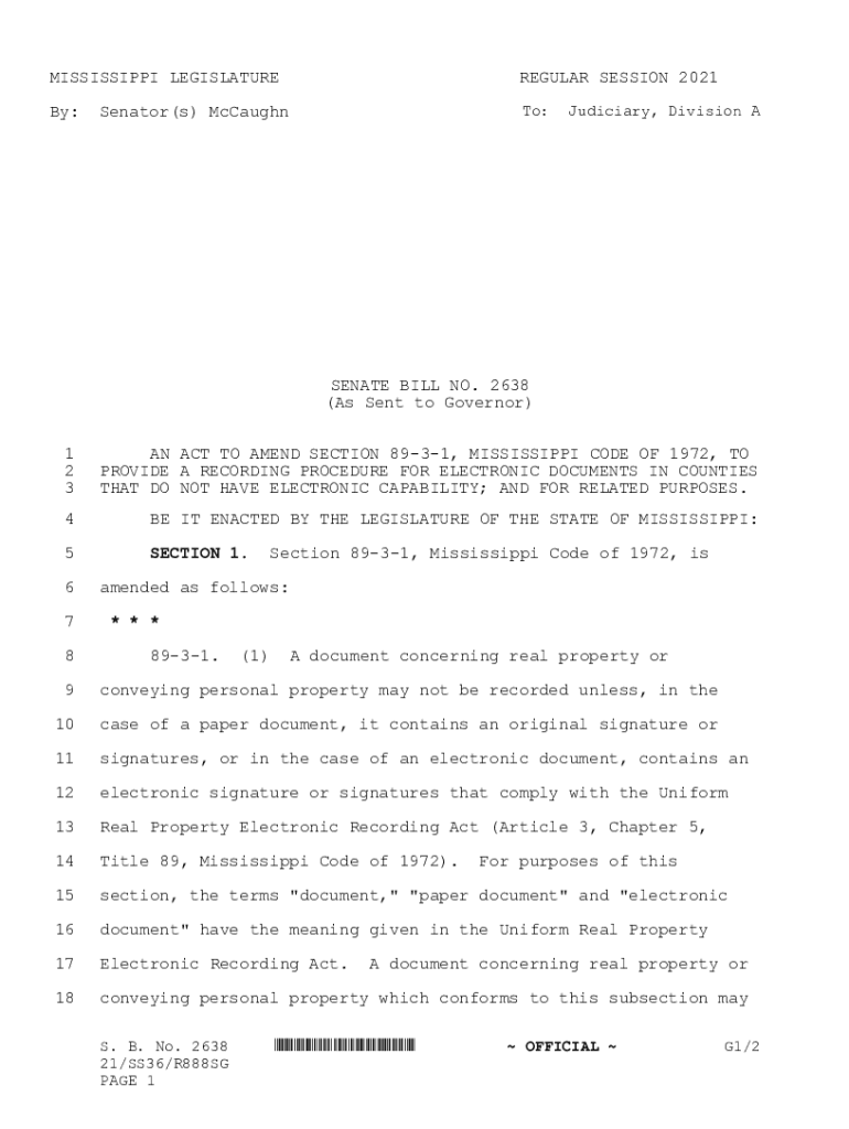 MISSISSIPPI LEGISLATUREREGULAR SESSION 2021By:To:Senator(s) McCaughnJudiciary, Division SENATE BILL NO. 2638 (As Sent to Governor) 1 2 3AN ACT TO AMEND SECTION 8931, MISSISSIPPI CODE OF 1972, TO PROVIDE