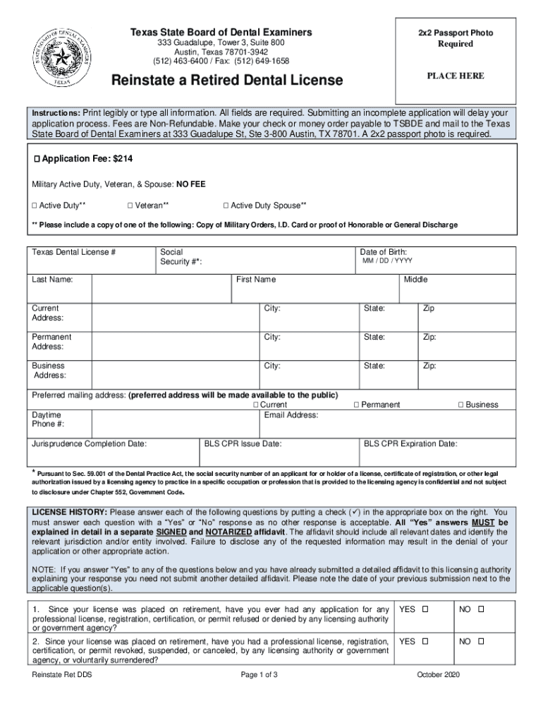 Texas State Board of Dental Examiners2x2 Passport Photo333 Guadalupe, Tower 3, Suite 800 Austin, Texas 787013942 (512) 4636400 / Fax: (512) 6491658RequiredPLACE HEREReinstate a Retired Dental LicenseInstructions: