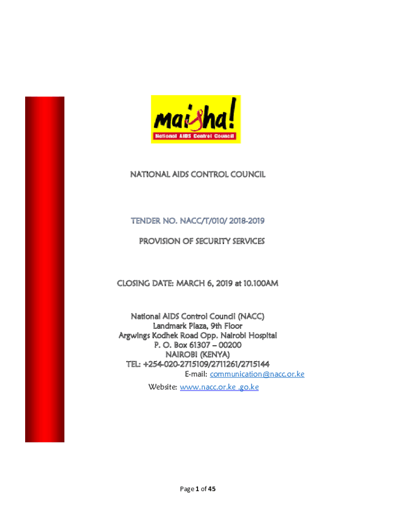 NATIONAL AIDS CONTROL COUNCILTENDER NO. NAC/T/010/ 20182019 PROVISION OF SECURITY SERVICESCLOSING DATE: MARCH 6, 2019, at 10.100AMNational AIDS Control Council (NAC) Landmark Plaza, 9th Floor Arguing