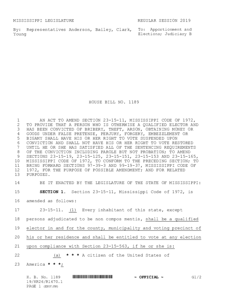 MISSISSIPPI LEGISLATUREREGULAR SESSION 2019By: Representatives Anderson, Bailey, Clark, Young: Apportionment and Elections; Judiciary HOUSE BILL NO. 11891 2 3 4 5 6 7 8 9 10 11 12 13AN ACT TO AMEND