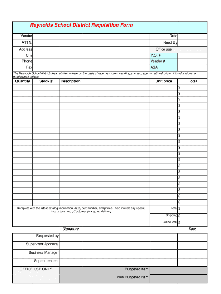 Reynolds School District Requisition Form VendorDateATTN:Need ByAddressOffice Udacity. O. #PhoneVendor #FaxASAThe Reynolds School district does not discriminate on the basis of race, sex, color, handicaps,