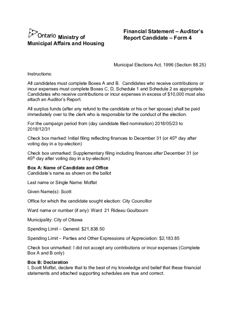 Ministry of Municipal Affairs and HousingFinancial Statement Auditors Report Candidate Form 4Municipal Elections Act, 1996 (Section 88.25) Instructions: All candidates must complete Boxes A and B.