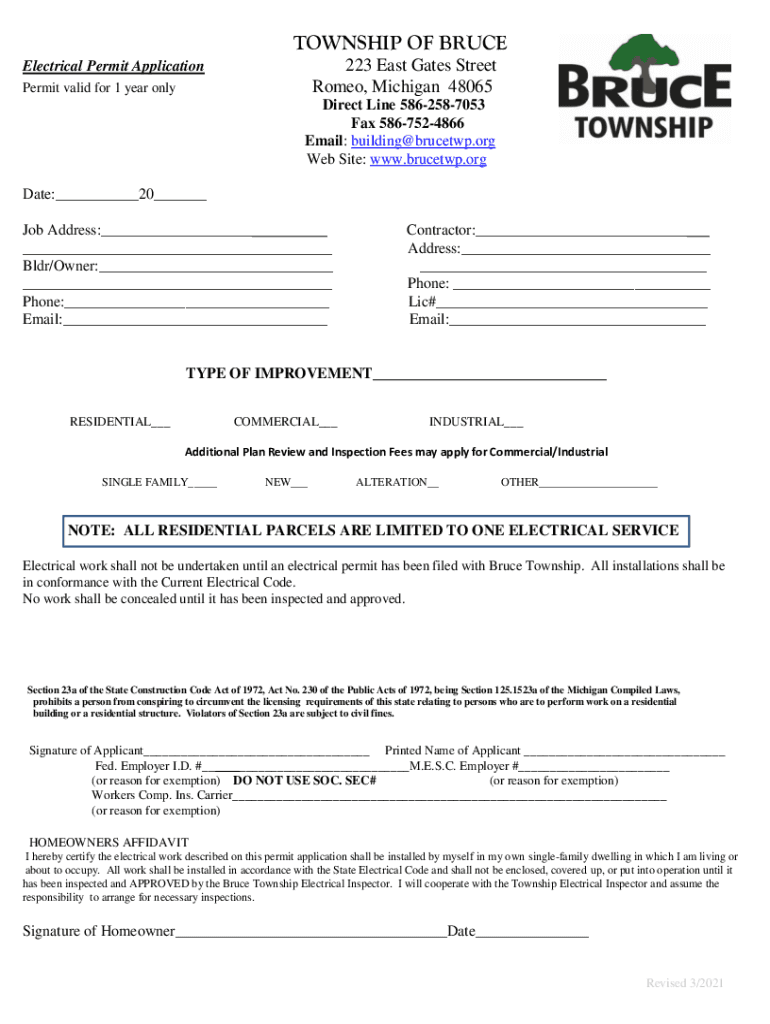 TOWNSHIP OF BRUCE 223 East Gates Street Romeo, Michigan 48065Electrical Permit Application Permit valid for 1 year indirect Line 5862587053 Fax 5867524866 Email: building@brucetwp.org Website: www.brucetwp.org