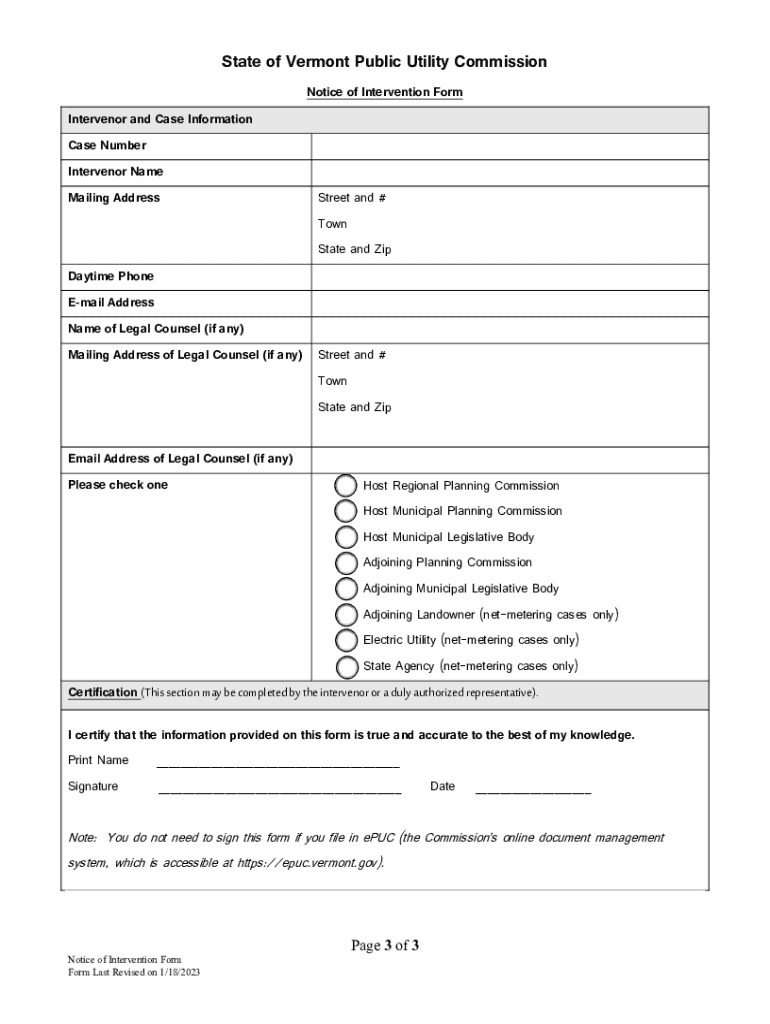 Get the free Notice of Intervention Form - Vermont Public Utility Commission