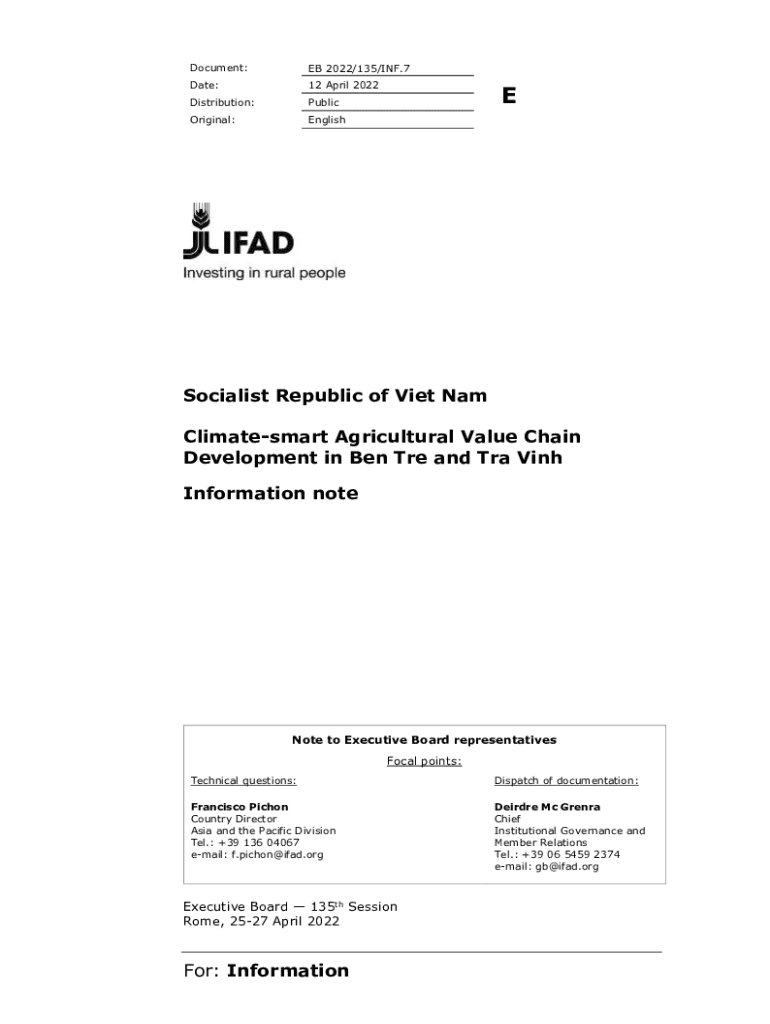 Document:EX 2022/135/INF.7Date:12 April 2022Distribution:PublicOriginal:EnglishESocialist Republic of View Nam Climate smart Agricultural Value Chain Development in Ben TRE and Trey Vine Information