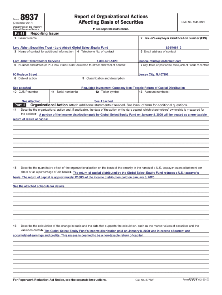 8937Report of Organizational Actions Affecting Basis of SecuritiesForm (December 2017) Department of the Treasury Internal Revenue Serviceman Ia See OMB No. 15450123separate instructions. Reporting