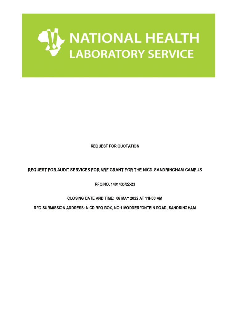 REQUEST FOR QUOTATIONREQUEST FOR AUDIT SERVICES FOR NRF GRANT FOR THE NICE SANDRINGHAM CAMPUS RFQ NO. 1401435/2223 CLOSING DATE AND TIME: 06 MAY 2022 AT 11H00 AM RFQ SUBMISSION ADDRESS: NICE RFQ BOX,