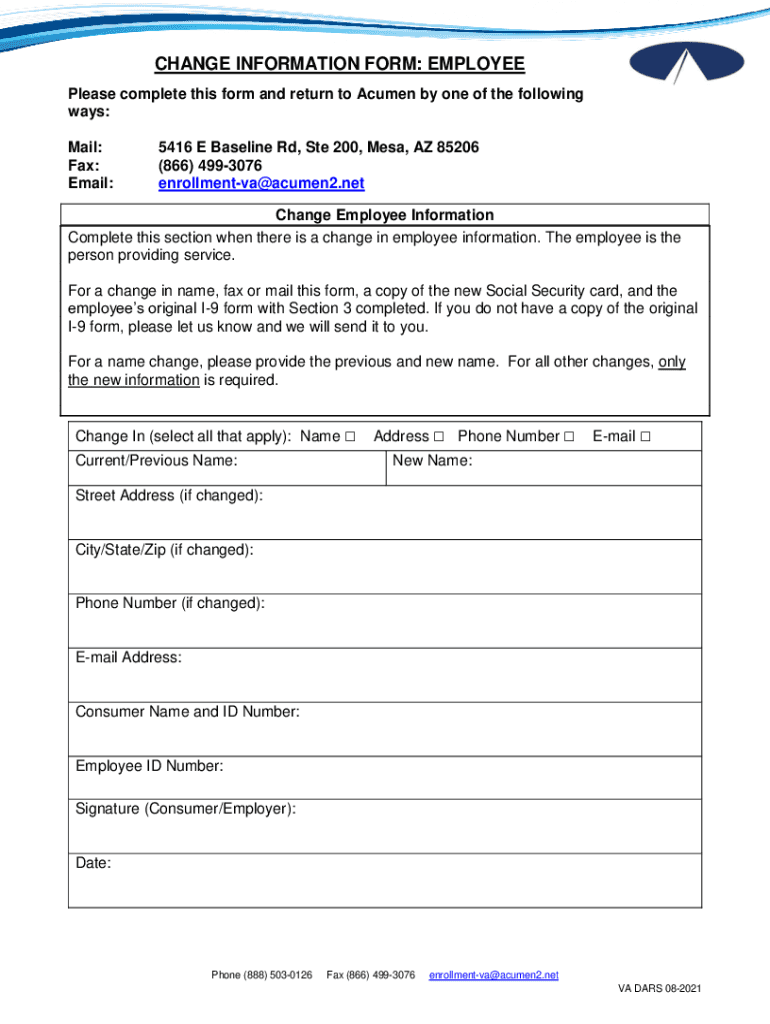 CHANGE INFORMATION FORM: EMPLOYEE Please complete this form and return to Acumen by one of the following ways: Mail: Fax: Email:5416 E Baseline Rd, Ste 200, Mesa, AZ 85206 (866) 4993076 enrollmentva@acumen2.netChange