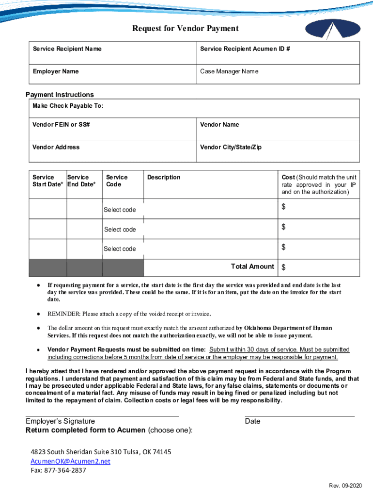 Request for Vendor Payment Service Recipient Nameserver Recipient Acumen ID #Employer Name Case Manager Repayment Instructions Make Check Payable To: Vendor VEIN or SS#Vendor NameVendor AddressVendor