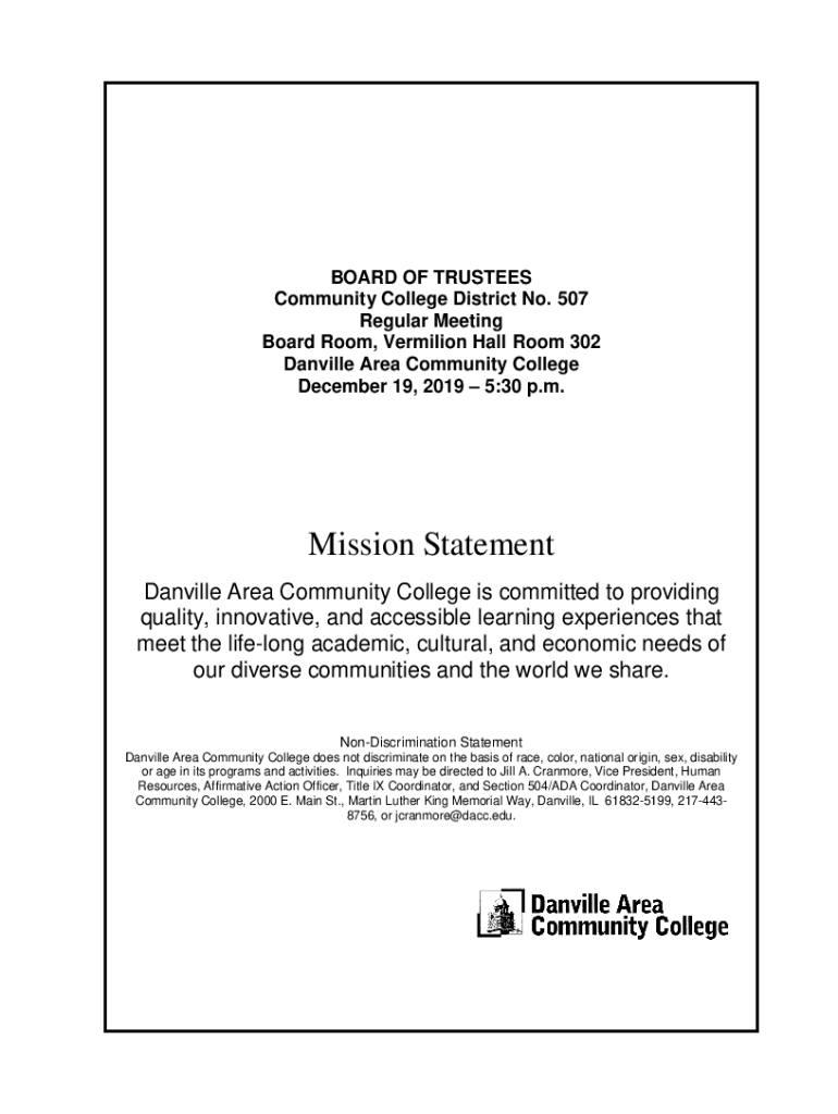 BOARD OF TRUSTEES Community College District No. 507 Regular Meeting Board Room, Vermilion Hall Room 302 Danville Area Community College December 19, 2019 5:30 p.m. Mission Statement Danville Area
