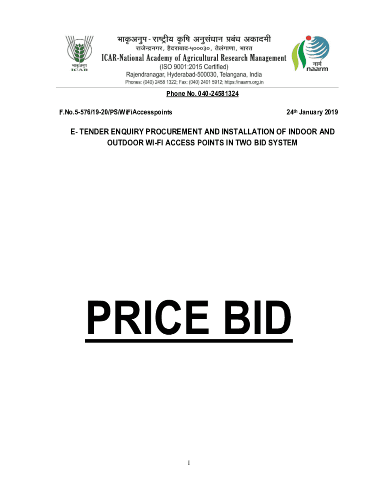 Phone No. 04024581324 F. No.5576/1920/PS/WiFiAccesspoints24th January 2019E TENDER Inquiry PROCUREMENT AND INSTALLATION OF INDOOR AND OUTDOOR Wi-Fi ACCESS POINTS IN TWO BID SYSTEMATIC BID 1PRICE SCHEDULE