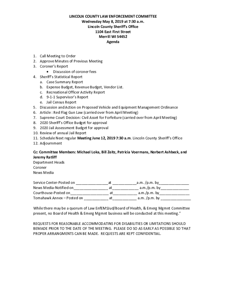 LINCOLN COUNTY LAW ENFORCEMENT COMMITTEE Wednesday, May 8, 2019, at 7:30 a.m. Lincoln County Sheriffs Office 1104 East First Street Merrill WI 54452 Agenda 1. Call Meeting to Order 2. Approve Minutes