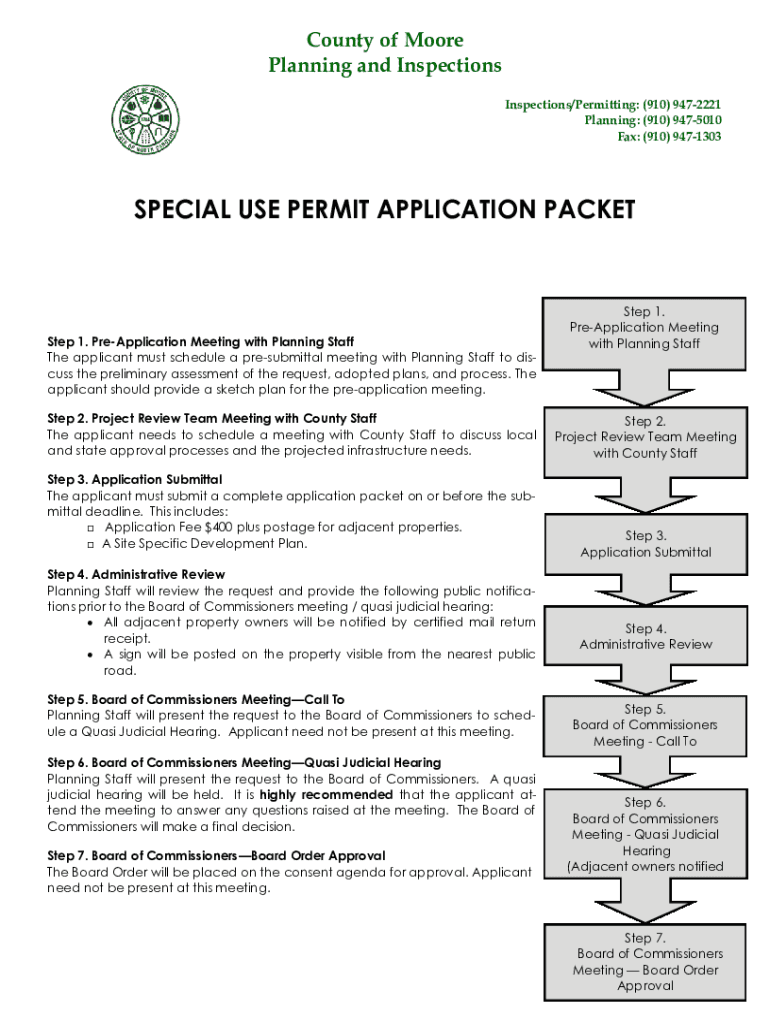 County of Moore Planning and Inspections/Permitting: (910) 9472221 Planning: (910) 9475010 Fax: (910) 9471303SPECIAL USE PERMIT APPLICATION Packets 1. Reapplication Meeting with Planning Staff The