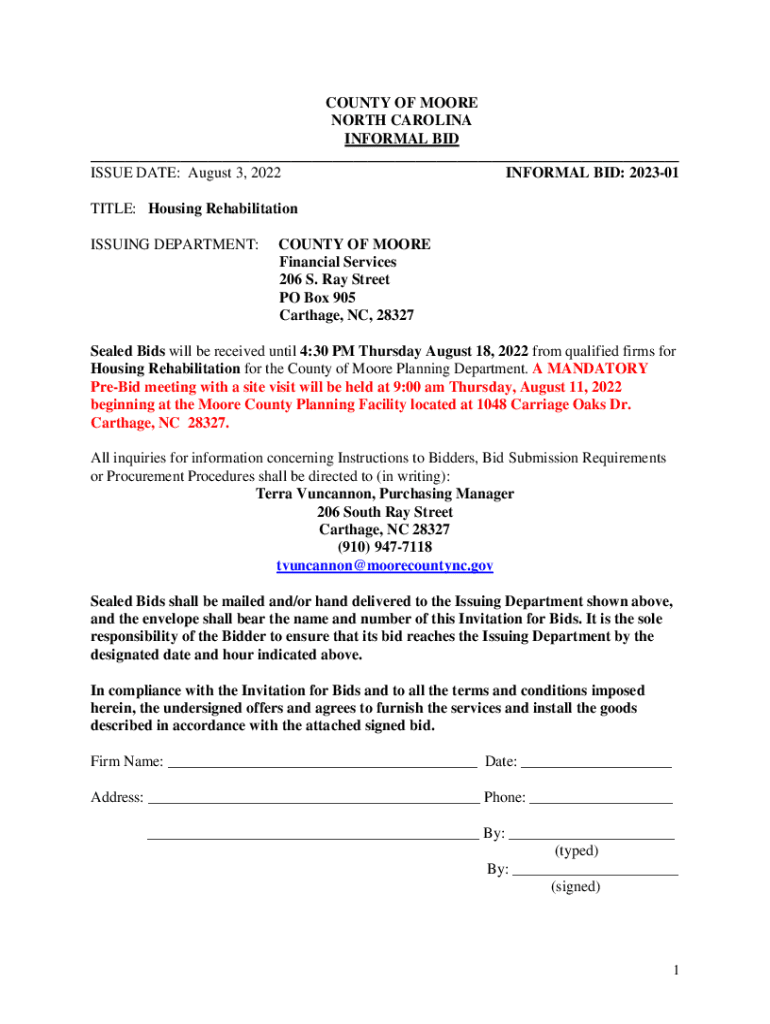 COUNTY OF MOORE NORTH CAROLINA INFORMAL BID ___ISSUE DATE: August 3, 2022INFORMAL BID: 202301TITLE: Housing Rehabilitation ISSUING DEPARTMENT:COUNTY OF MOORE Financial Services 206 S. Ray Street PO