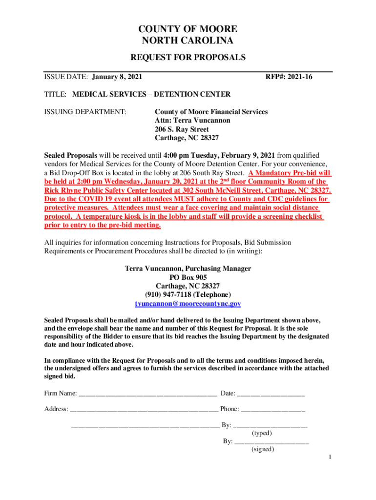 COUNTY OF MOORE NORTH CAROLINA REQUEST FOR PROPOSALS ISSUE DATE: January 8, 2021RFP#: 202116TITLE: MEDICAL SERVICES DETENTION CENTER ISSUING DEPARTMENT:County of Moore Financial Services Attn: Terra