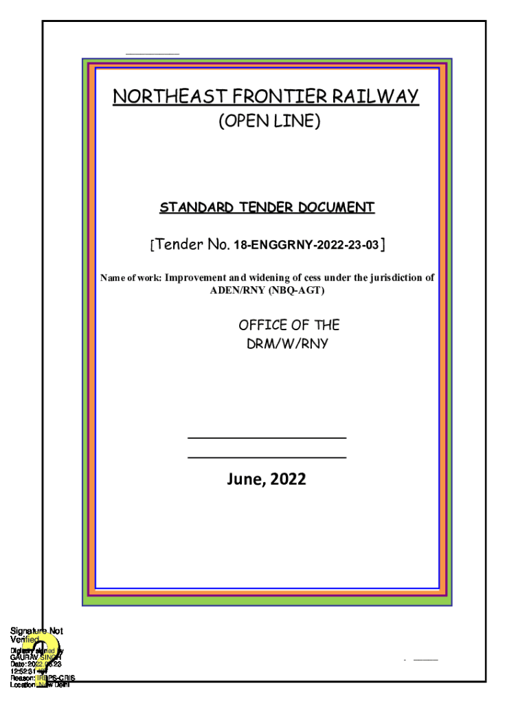 TENDER FORMS Tender No.___1NORTHEAST FRONTIER RAILWAY (OPEN LINE)STANDARD TENDER DOCUMENT [Tender No. 18ENGGRNY20222303]Name of work: Improvement and widening of CESS under the jurisdiction often/ANY
