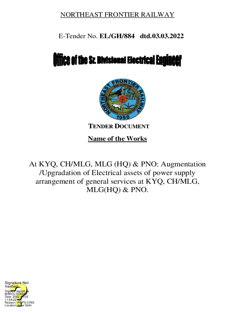 NORTHEAST FRONTIER RAILWAY Tender No. EL/GH/884 did.03.03.2022TENDER DOCUMENT Name of the Works At AYQ, CH/ML, ML (HQ) & NO: Augmentation /Upgrade of Electrical assets of power supply arrangement