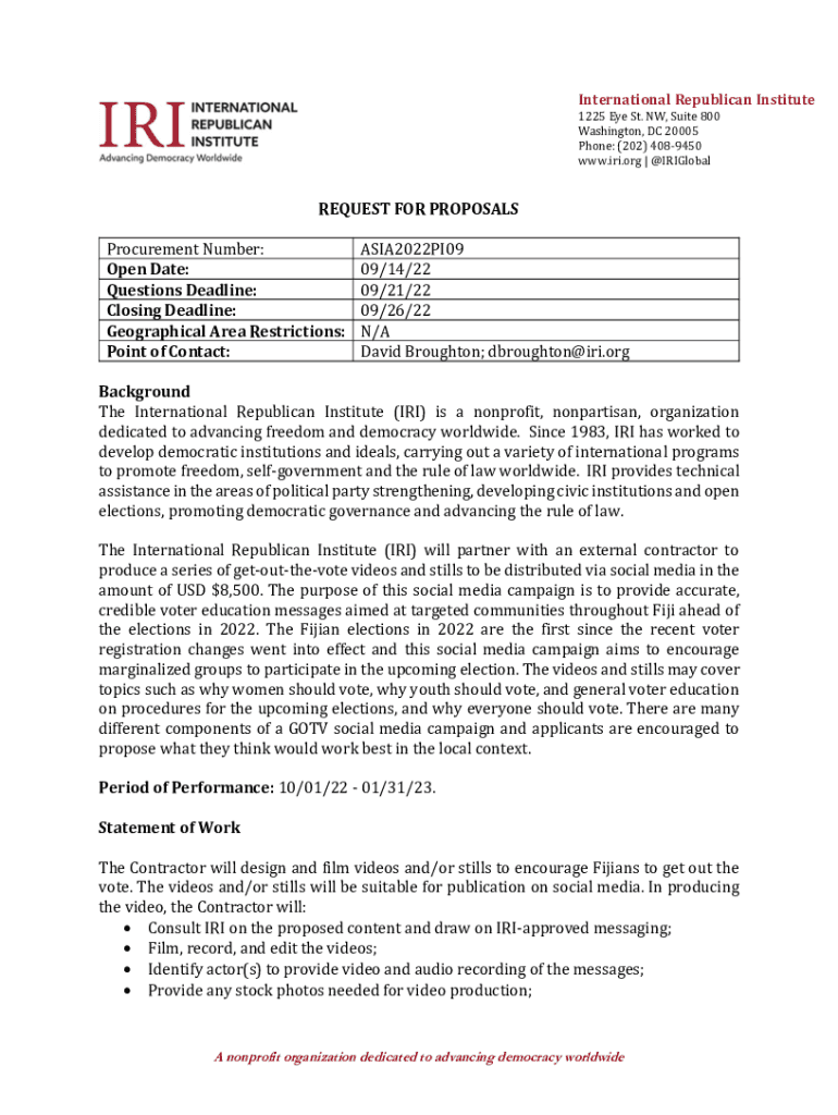 International Republican Institute 1225 Eye St. NW, Suite 800 Washington, DC 20005 Phone: (202) 4089450 www.iri.org | @IRIGlobalREQUEST FOR PROPOSALS Procurement Number: Open Date: Questions Deadline: